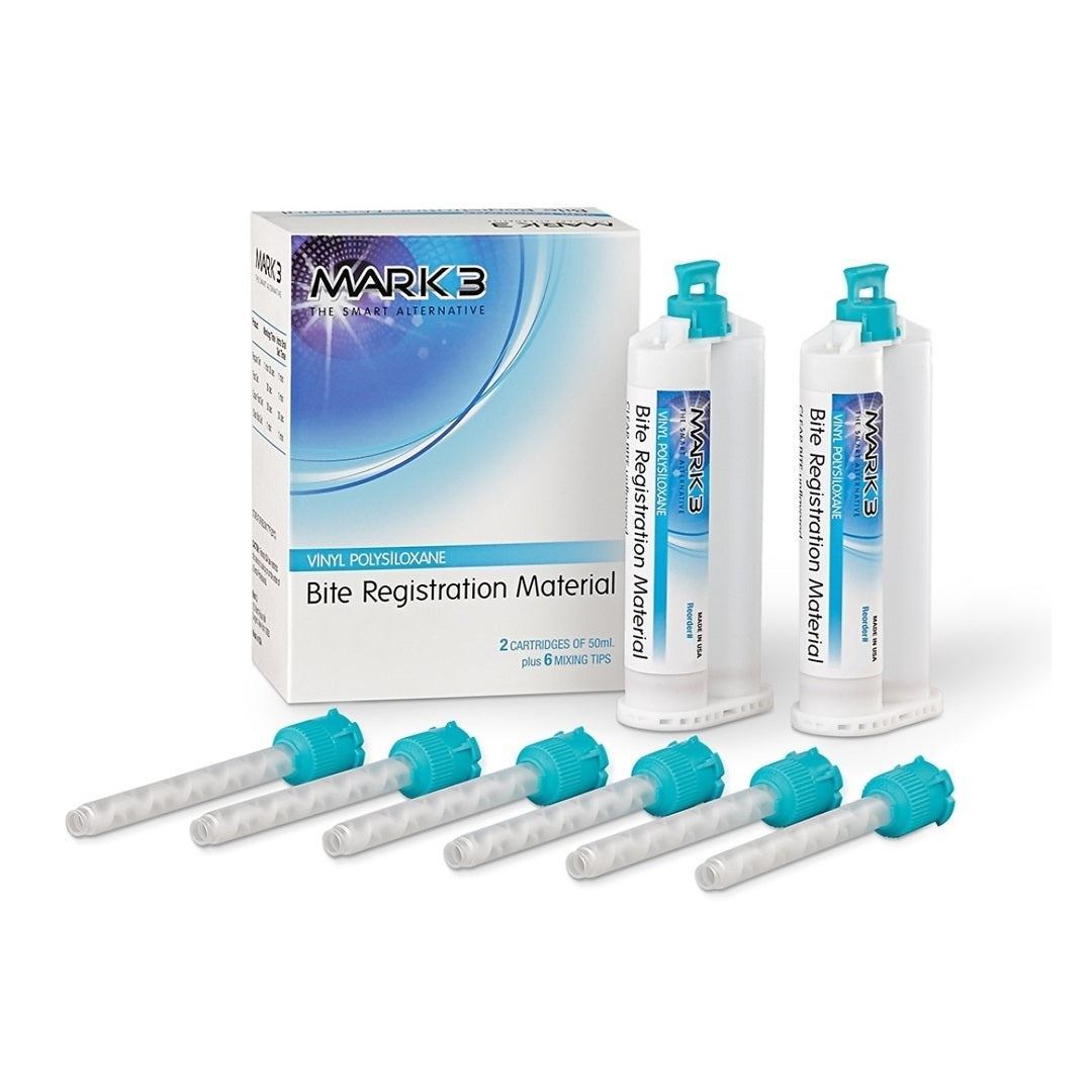 MARK3 Bite Registration Fast Set VPS Impression Material 50mL Cartridges 2/Pk (0219) is a high-performance vinyl polysiloxane (VPS) material formulated specifically for accurate bite registrations. With a mousse-like consistency and fast-set formula, this material delivers precise occlusal records while maximizing patient comfort. Its easy-extrude formulation requires less force, reducing hand fatigue and allowing for controlled placement. The set material achieves plaster-like hardness, making it ideal for scanning, digital impressions, and conventional bite registrations. This kit includes 2 cartridges and 6 mixing tips, offering a convenient, efficient solution for clinical use.